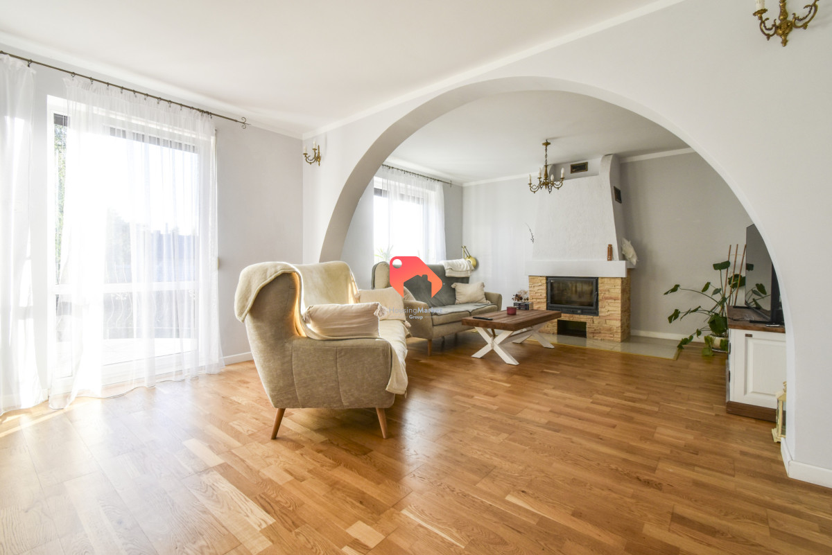 parter: przestronny salon, kuchnia z nowoczesną zabudową (ma tylko 3 lata!), mała jadalnia (możliwość przerobienia na spiżarnię), duży salon z kominkiem oraz częścią jadalnianą, sypialnia /gabinet, łazienka z prysznicem,