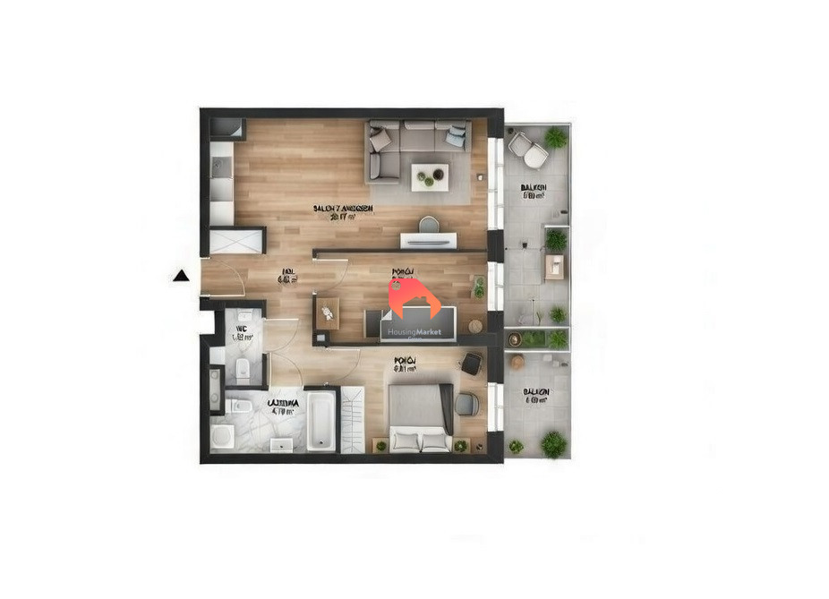 - Dwa balkony: 6,00 m² oraz 3,74 m²