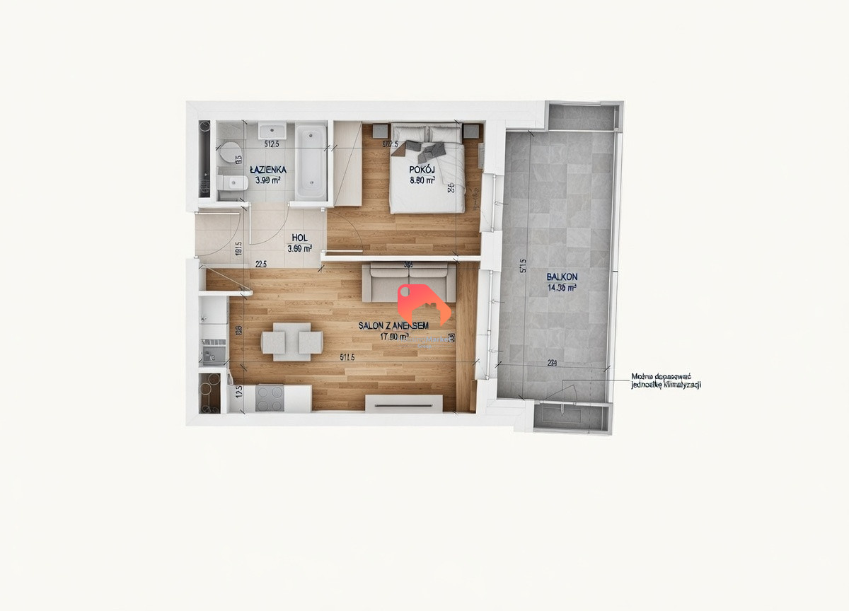 - Salon z aneksem kuchennym - 17,80 m² Przestronna, dobrze doświetlona część dzienna z miejscem na aneks kuchenny i strefę wypoczynkową. Bezpośrednie wyjście na balkon.