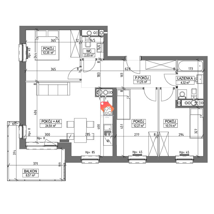 - 3 pokoje 12,35, 12,27 i 10,74m2