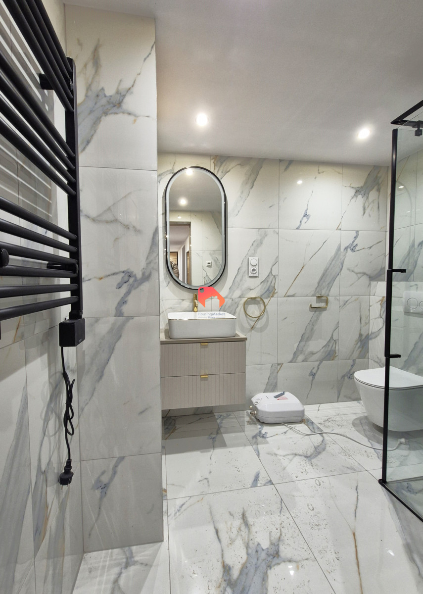 3/ elegancka łazienka wykończona, z dbałością o detale i estetykę, z WC i kabiną prysznicową (ok.5m2);