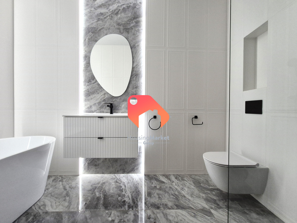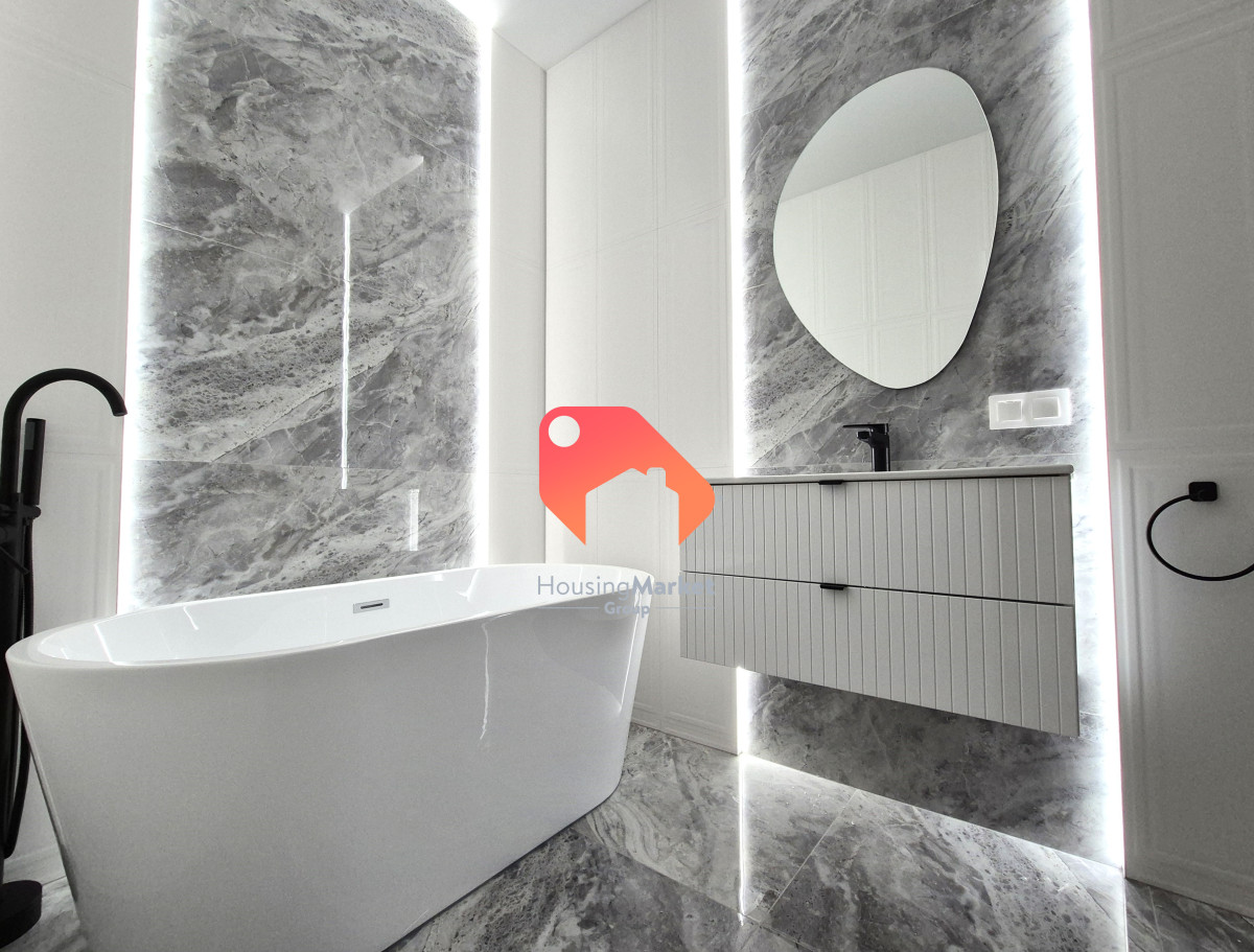 - łazienka na piętrze wyłożona nowoczesnymi płytkami z wzorem jasnego marmuru, z dużą, wolnostojącą wanną z baterią stojącą na podłodze, prysznicem oddzielonym szybą, nowoczesnym, podświetlanym lustrem owalnym, toaletą typu Geberit z umiejscowioną nad nim półką wnękową, dużą szafką białą z dwiema szufladami oraz umywalką nablatową,