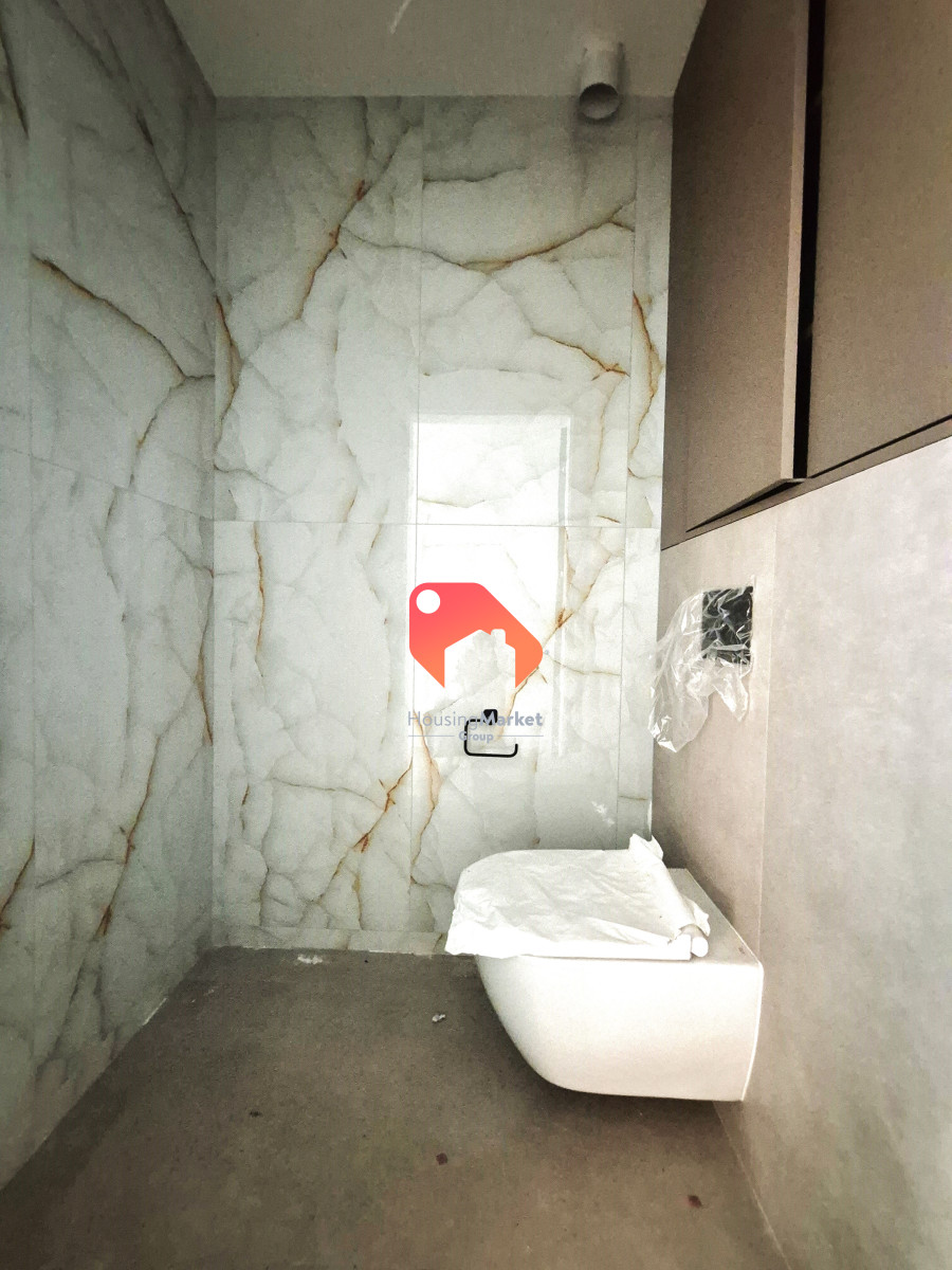 - toaleta na parterze wyłożona wielkoformatowymi płytkami z wzorem marmuru, wyposażona w toaletę typu Geberit - podwieszaną, będzie niebawem zamontowana nowoczesna szafka z umywalką, nad toaletą zabudowa wykonana na zamówienie z licznymi półkami na chemię gospodarczą i kosmetyki,