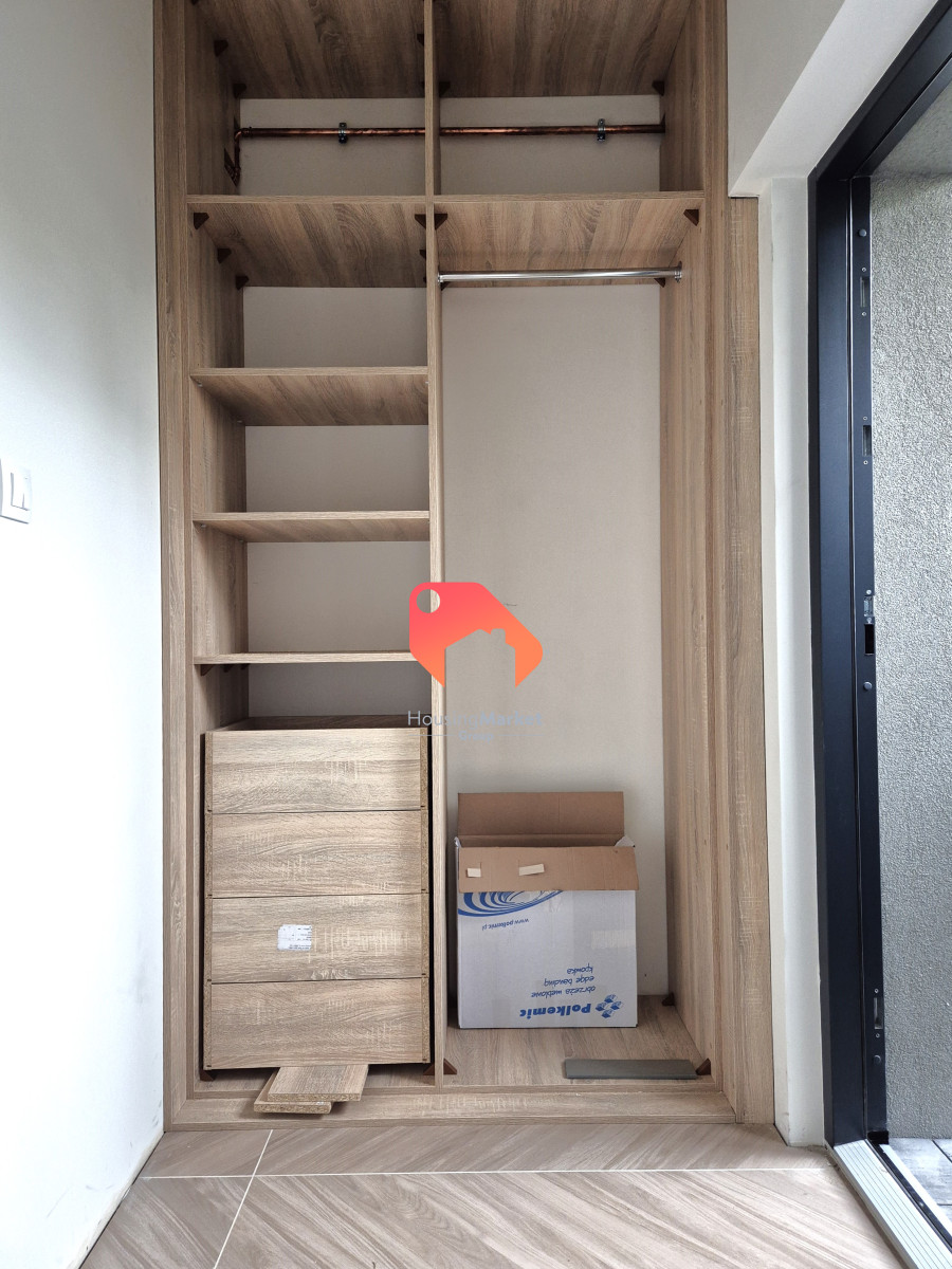 - w największej sypialni szafa w zabudowie przesuwna czterodrzwiowa z licznymi półkami, szufladami i relingami wykonana z płyty meblowej w kolorze jesionu,