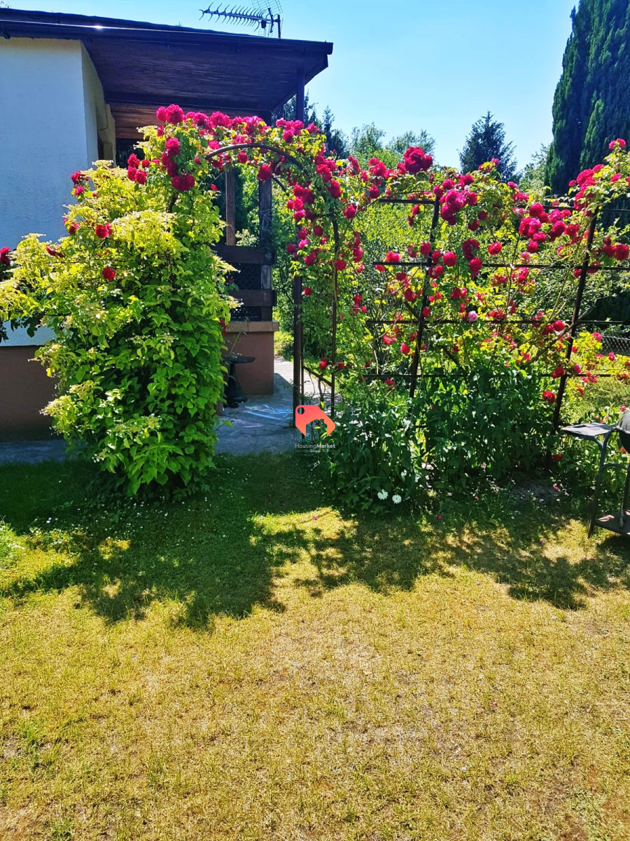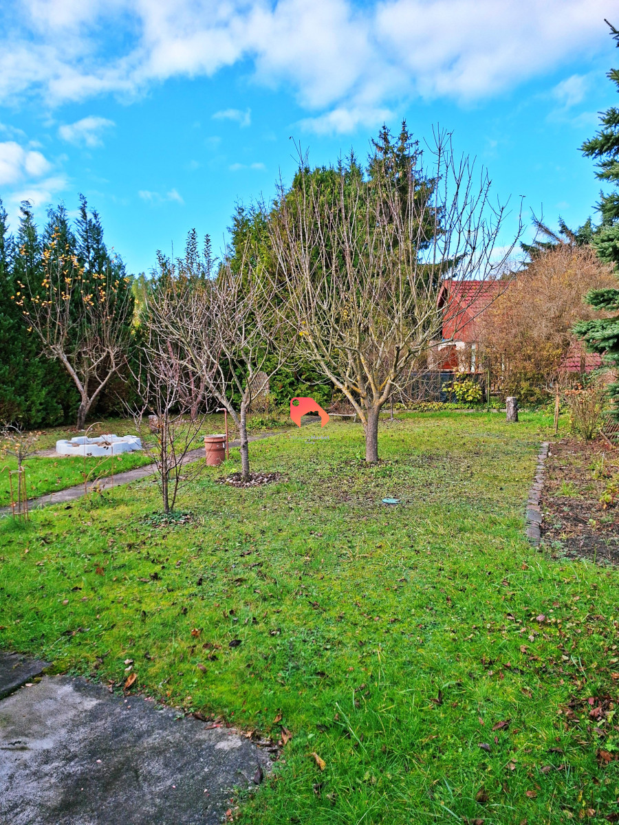 Działka o powierzchni 450 m² jest w całości ogrodzona, z licznymi nasadzeniami zapewniającymi prywatność. Na jej terenie przygotowano miejsce parkingowe dla 2 samochodów.