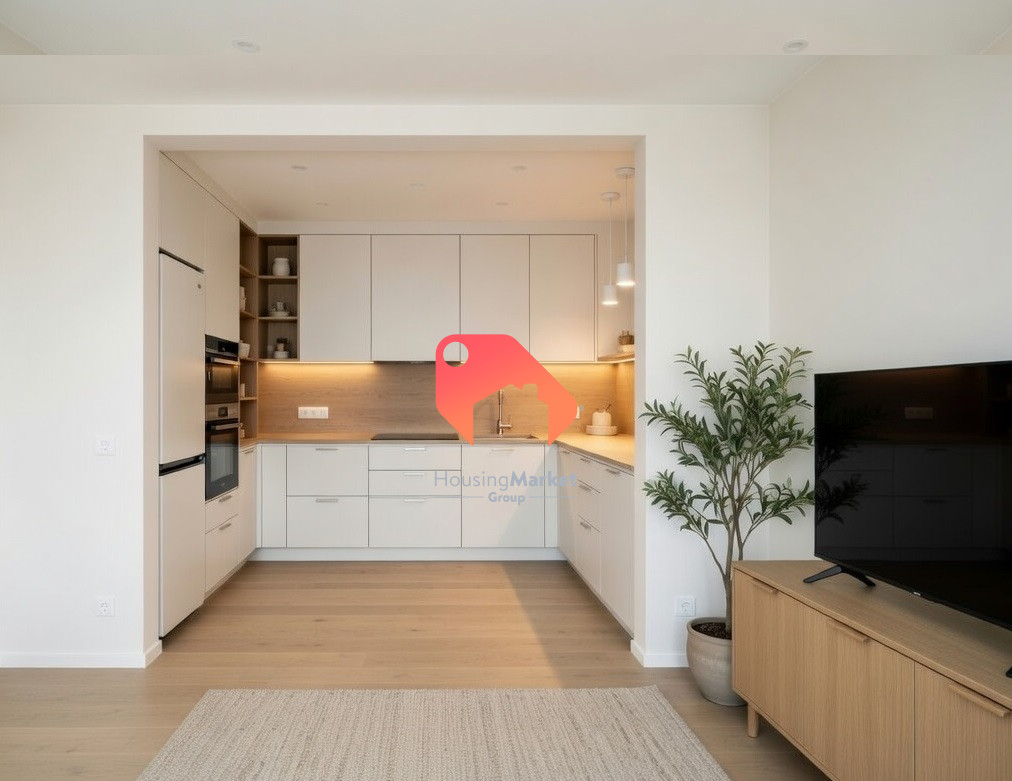 Sercem mieszkania jest przestronny salon z aneksem kuchennym, który stanowi otwartą, jasną strefę dzienną. Dzięki dużym przeszkleniom wnętrze jest doskonale doświetlone, a bezpośrednie wyjście na balkon stanowi dodatkową przestrzeń do relaksu. Aneks kuchenny został zaplanowany w sposób umożliwiający wygodne zagospodarowanie zarówno strefy gotowania, jak i części jadalnianej.
